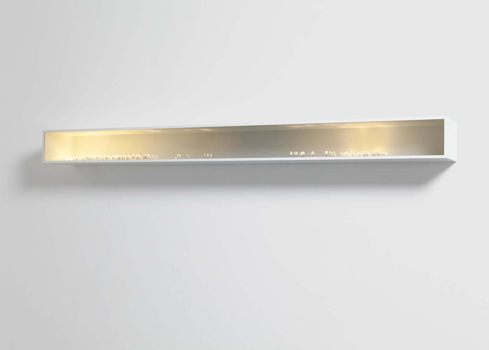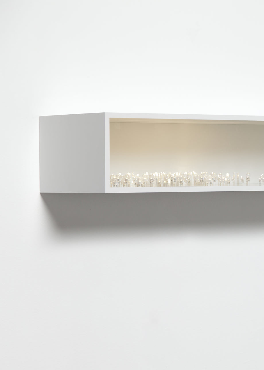 Exhibiting each individual led as a specimen, an industrial product, Light Line remarkably continues Humans since 1982’s explorations of light and led illuminants in all their diversity; framed and focused by the pristine cabinet to emphasise its essence: the light’s interaction with its space.