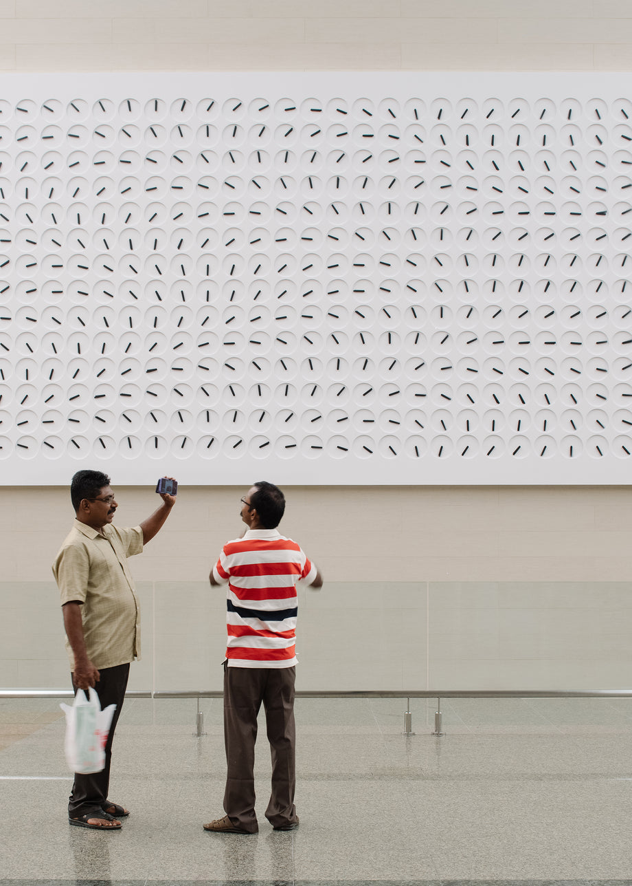 With four years of development time, this is the largest and most ambitious work within Humans since 1982's A million Times project (2013-ongoing). A million Times at Changi comprises 504 clock-faces in which the hour and minute hands have been programmed to spin individually and in formation to visually represent the abstract concept of passing time while continuing to report real time. Each choreographed sweep of hands appears to be unlike the last until they join in perfect, synchronised alignment to accurately tell time through digital typography.