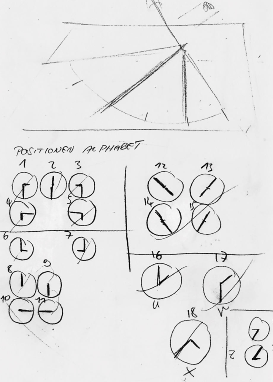 The duo started experimenting with patterns of randomly fallen toothpicks and devised an animated font system based on moving clock faces. They made the clock hands stop in certain positions to create letters and digits. Once the clock hands rotated again, the characters would fall apart.
